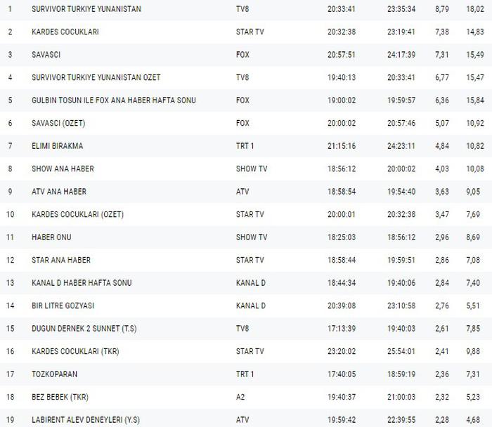 03 Şubat 2019 Pazar günü Reyting Sonuçları Açıklandı! En sevilen dizi ve programların yer adlığı Pazar gününde en çok hangi dizi izlendi? Reyting sonuçlarında hangi dizi ve programlar ilk sırada yer aldı? Kardeş Çocukları dizisi reyting sonuçları. Kaçış dizisi reyting sonuçları. Savaşçı reyting sonuçları. Star Tv Kardeş çocukları tuttu mu? 03 Şubat Pazar günü hangi dizi daha çok izlendi. En sevilen dizilerin bir arada olduğu Pazar akşamında seyirci reyting sonuçlarını beklemeye başladı. Peki reyting sonuçlarına göre hangi dizi kaçıncı oldu? İşte 03 Şubat Pazar 2019 reyting sıralamaları ile ilgili tüm gelişmeler...