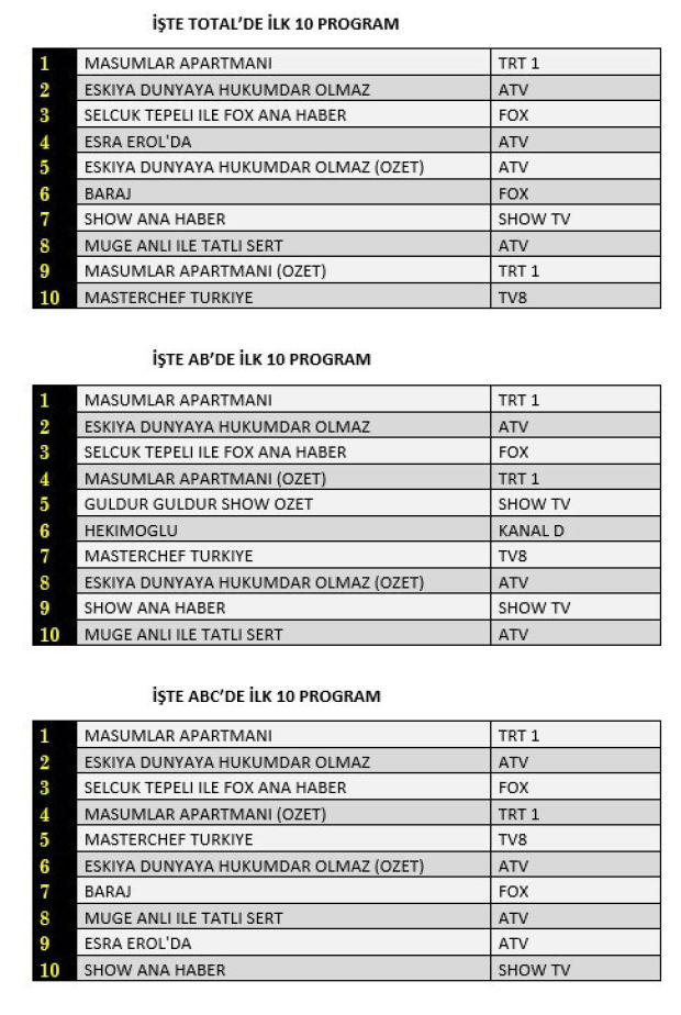 ABC kategorisinde ise ikinci sıra değişmedi. EDHO ikinci, MasterChef Türkiye beşinci, Baraj dizisi yedinci sırada günü tamamlayan yapım oldu. Güldür Güldür Show ve Hekimoğlu üç reyting kategosinden sadece birinde ilk 10'da yer alan yapım oldu.