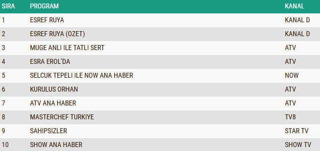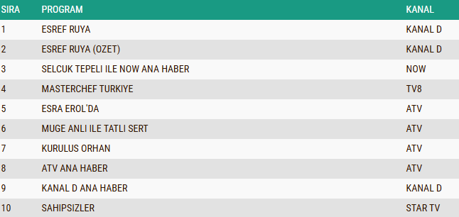 Listenin zirvesinde, güçlü hikâyesi ve dikkat çeken oyunculuklarıyla her hafta merakla takip edilen “Eşref Rüya” dizisi yer aldı. Dizi, AB grubunda aldığı yüksek izlenme oranıyla günün birincisi olmayı başardı.
