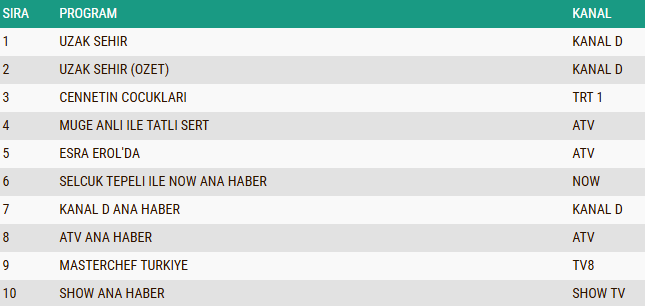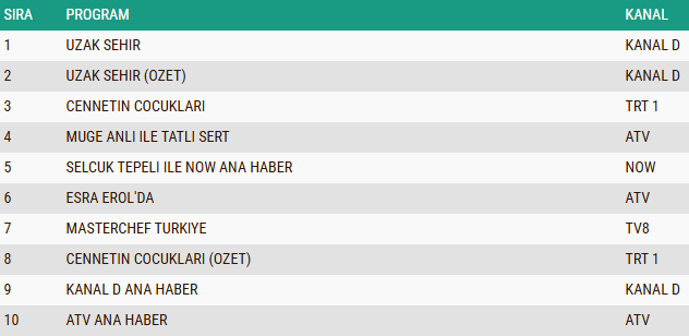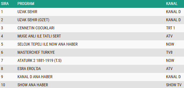 TRT 1'in duygusal yapımı Cennetin Çocukları ise üçüncü sıraya yerleşerek güçlü performansını devam ettirdi. Öte yandan, Müge Anlı ile Tatlı Sert ve Esra Erol'da gibi gündüz kuşağının sevilen programları da akşam listesinde yer bulurken, ana haber bültenleri geniş izleyici kitlesi ile dikkat çekti.