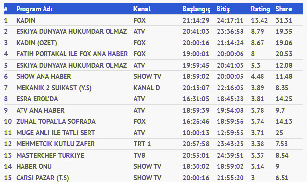 Geçen hafta tüm reyting kategorilerinde birinci sırada yer alan Fox ekranlarının sevilen dizisi Kadın, liderliğini bu haftada sürdürdü. En yakın rakibi Eşkiya Dünyaya Hükümdar Olmaz dizisine her iki gruptada büyük fark atmayı başaran dizi tüm reyting kategorilerinde birinci sırada yer aldı.