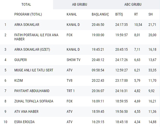 15 Şubat reyting sonuçları Total grubunda, Kanal D'nin Arka Sokaklar dizisi 21,71 share ile ilk sırada, Fox Tv ekranlarının haber programı Fatih Portakal İle Fox Ana Haber 20,00 share ile ikinci sırada, Arka Sokaklar özet programı 16,18 share ile üçüncü sırada yer aldı.