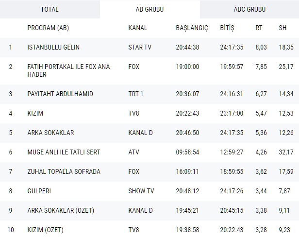 15 Şubat reyting sonuçları AB grubunda, Star Tv'nin İstanbullu Gelin dizisi 18,35 share ile ilk sırada, Fox Tv ekranlarının haber programı Fatih Portakal İle Fox Ana Haber 25,17 share ile ikinci sırada, Trt 1 ekranlarının başarılı dizisi Payitaht Abdülhamid ise 14,34 share ile üçüncü sırada yer aldı.