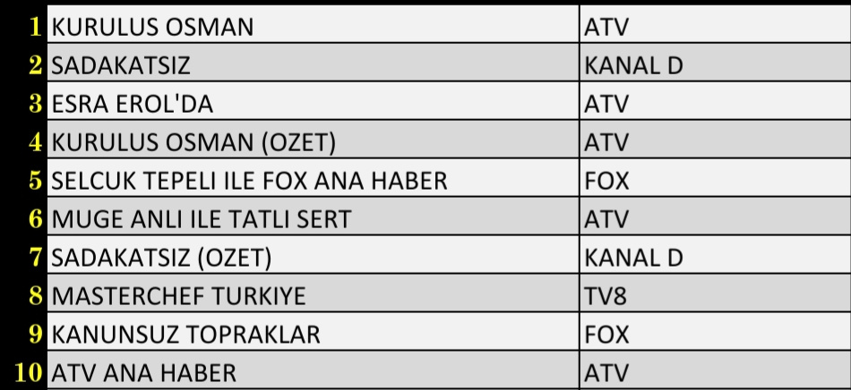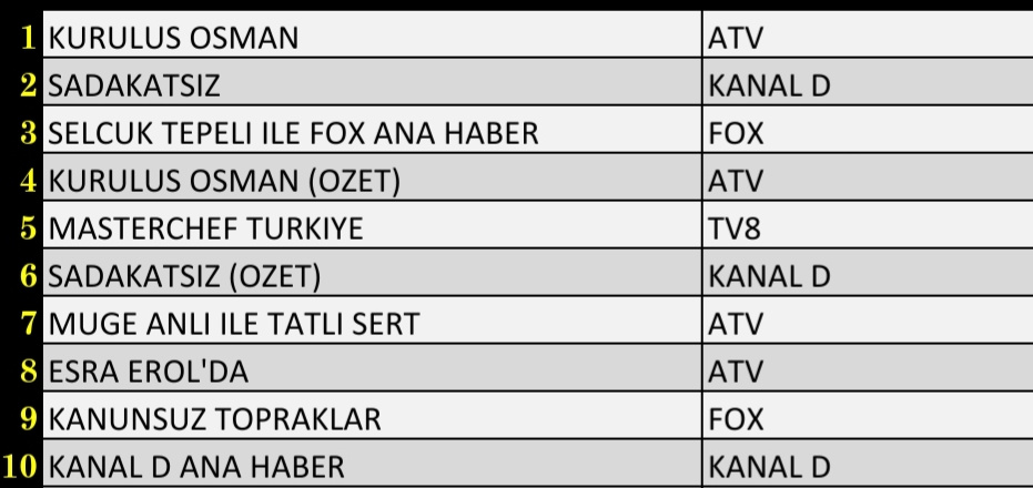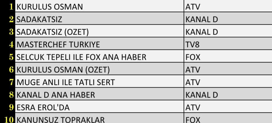 Total izleyici grubunda dün en çok izlenen atv'de yayınlanan 'Kuruluş Osman' dizisi oldu. Kanal D'nin yüksek izlenme oranların sahip dizisi 'Sadakatsiz' listenin ikinci sırasında yer aldı. Tv8'de yeni bölümüyle yayınlanan 'MasterChef Türkiye' listenin sekizinci sırasında kendine yer bulurken, 'Kanunsuz Topraklar' dizisi günü dokuzuncu sırada tamamlayan dizi oldu. Star TV'de yayınlanan 'Ada Masalı' dizisi ise total izleyici grubunda ilk 10'da yer alamadı.