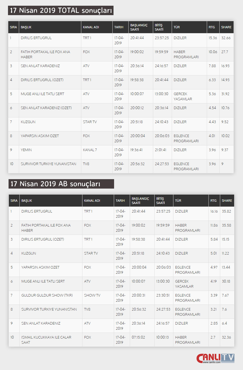 17 Nisan Çarşamba Reyting Sonuçları