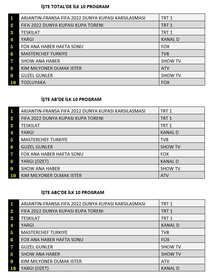 Yine bir TRT yapımı olan “Teşkilat” tüm gruplarda üçüncü olarak büyük bir başarıya imza attı. Hemen ardından gelerek 4.lük koltuğuna oturan Kanal D dizisi “Yargı”da tüm gruplarda aynı başarıyı yakaladı.