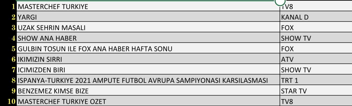 NOT: Televizyon İzleme Araştırma Komitesi (TİAK) tarafından ölçümlenen reyting sonuçlarının detaylarını ve ilk 100 program sıralaması yayınlanması yasaklandığı için sadece ilk 10 sıralamayı paylaşabiliyoruz.