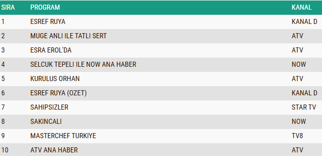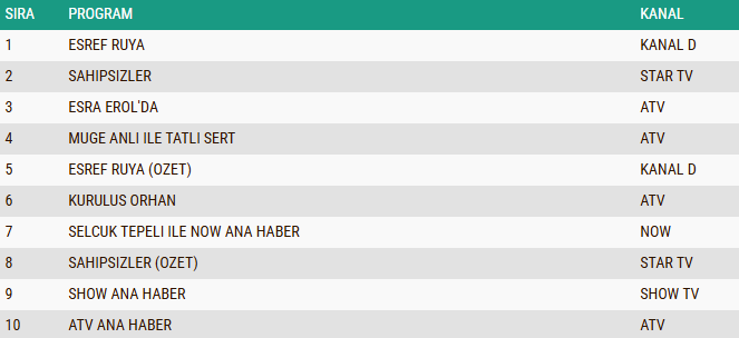Total reyting grubunda "Eşref Rüya" bir kez daha zirvenin sahibi olurken, güçlü temposuyla dikkat çeken "Sahipsizler" dizisi ikinci sıraya yerleşti. Gündüz kuşağının sevilen programı Esra Erol'da ise istikrarlı performansını sürdürerek üçüncü sıradan listeye girdi.