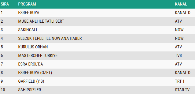 AB reyting grubunda “Eşref Rüya” dizisi bir kez daha liderliği kimseye bırakmadı ve günün en çok izlenen yapımı olarak listenin başında yer aldı. Gündüz kuşağının vazgeçilmez programı “Müge Anlı ile Tatlı Sert” güçlü takipçi kitlesi sayesinde ikinci sıraya yerleşirken, ele aldığı sıra dışı konularla dikkat çeken “Sakıncalı” dizisi ilk bölümüyle üçüncü sıradan listeye girmeyi başardı.