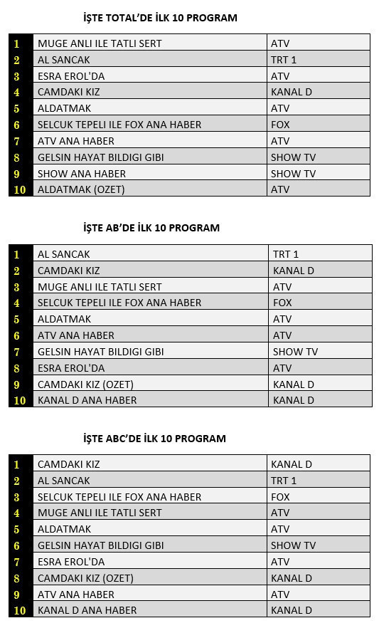 Not: TİAK'ın aldığı karar nedeniyle reyting sonuçlarının detaylarını ve ilk 100 program sıralamasını yayınlayamıyoruz.