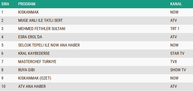 AB kategorisinde reyting yarışının kazananı “Kıskanmak” dizisi oldu. Dram yüklü sahneleri ve güçlü oyuncu kadrosuyla dikkat çeken dizi, Salı akşamının en çok izlenen yapımı olmayı başardı. Onun hemen ardından, tarihi atmosferi ve yüksek prodüksiyon kalitesiyle öne çıkan dizi “Mehmed: Fetihler Sultanı” ikinci sıraya yerleşti. Gecenin üçüncüsü ise psikolojik derinliği, karakter çatışmaları ve sürükleyici hikâyesiyle izleyiciyi ekrana bağlayan “Kral Kaybederse” dizisi oldu.