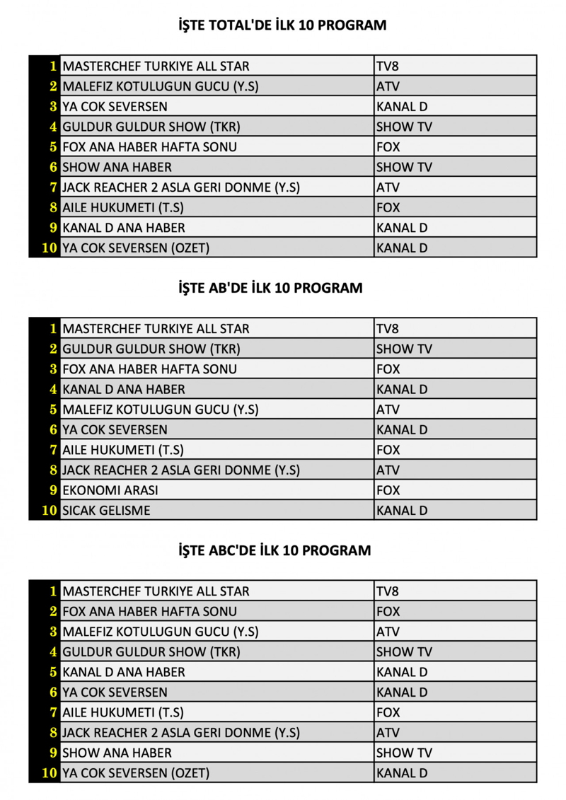 Yapımcı ve oyuncuların en çok merak ettiği reyting ölçümü olan Total'de 1. sırada TV8'de izleyici ile buluşan "MasterChef Türkiye All Star", 2. sırada ATV'de ekranlara gelen "Melefiz 2: Kötülüğün Gücü", 3. sırada ise Kanal D'de yayınlanan "Ya Çok Seversen" yer aldı. İzleyicilerin heyecanla takip ettiği bir başka reyting ölçümü olan AB'ye baktığımızda 1. sırada "MasterChef Türkiye All Star", 2. sırada "Güldür Güldür Show" tekrar bölümü, 3. sırada ise "Fox Ana Haber Hafta Sonu" yer aldığını gözlemledik. Son olarak ABC1’e baktığımızda yarışın MasterChef Türkiye, Fox Ana Haber ve Malefiz 2 şeklinde sıralandığını müşahede ediyoruz. İşte düne damga vuran 2 Eylül Reyting tablosu.