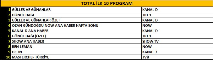 20 Aralık 2025 Cumartesi gününe ait reyting sonuçları belli olurken, Total kategorisinde zirvenin sahibi değişmedi. Yeni sezonda da güçlü izlenme oranlarıyla dikkat çeken dizi “Güller ve Günahlar”, yayınlandığı akşam en çok izlenen yapım olarak birinci sıraya yerleşti. Uzun süredir ekranların sevilen dizileri arasında yer alan ve geniş bir izleyici kitlesine sahip olan “Gönül Dağı” dizisi ise istikrarlı performansıyla ikinci sırada kendine yer buldu. Gecenin dikkat çeken bir diğer detayı ise “Güller ve Günahlar”ın özet bölümünün üçüncü sıraya yükselmesi oldu. Ortaya çıkan bu sonuç, dizinin ana bölümüyle birlikte özetinin de yüksek ilgi gördüğünü ve Cumartesi akşamına damga vurduğunu ortaya koydu.