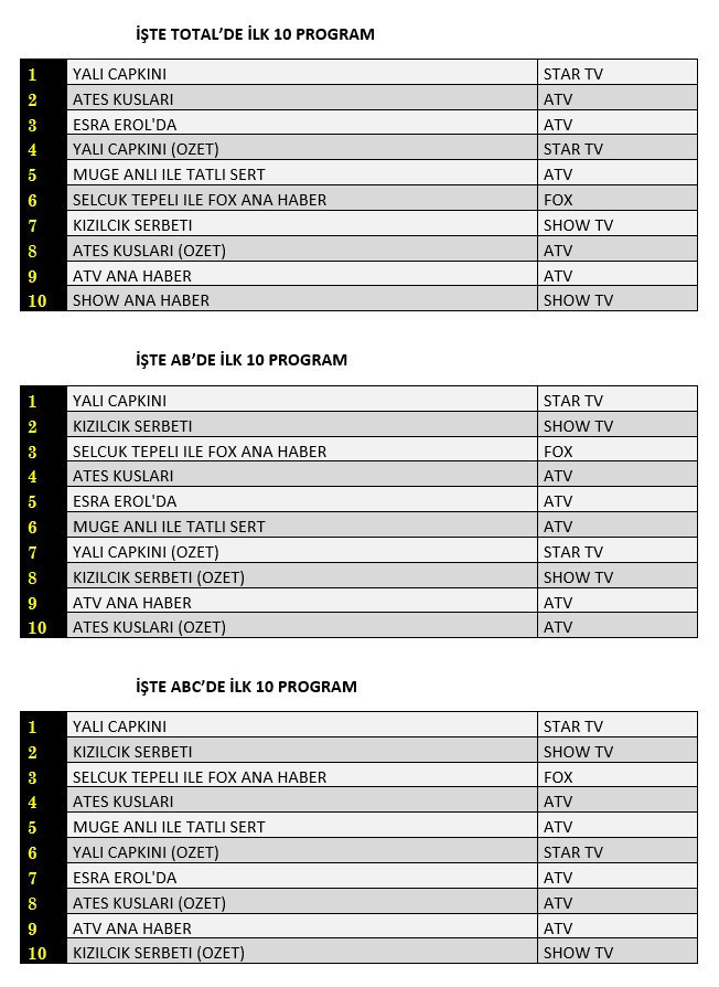 Not: TİAK'ın aldığı karar nedeniyle reyting sonuçlarının detaylarını ve ilk 100 program sıralamasını yayınlayamıyoruz.