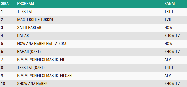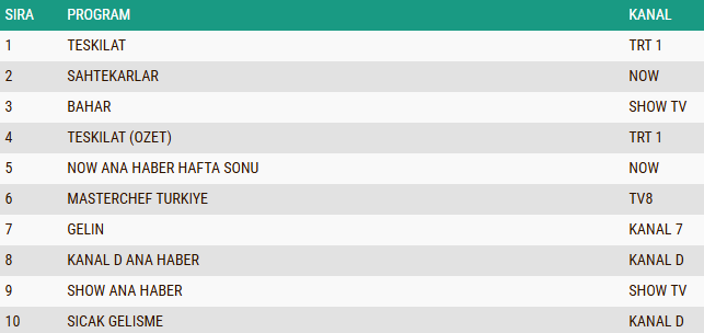 21 Aralık 2025 Pazar gününe ait reyting verileri netleşti ve prime time kuşağında yaşanan rekabetin kazananları belli oldu. Total izleyici grubunda uzun süredir istikrarlı performansıyla dikkat çeken dizi Teşkilat, yeni bölümüyle günün en çok izlenen yapımı olarak zirvede yer aldı. Onu, sürükleyici hikâyesi ve artan izleyici ilgisiyle Sahtekarlar dizisi takip ederek ikinci sıraya yerleşti. Akşam kuşağının bir diğer güçlü yapımı olan Bahar ise geniş izleyici kitlesiyle üçüncü sırada kendine yer buldu.