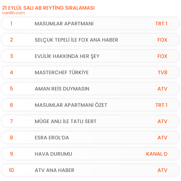21 Eylül AB reyting kategorisinde ise günün en çok izlenen yapımı TRT 1'de yayınlanan 'Masumlar Apartmanı' oldu. Listenin ikinci sırasında 'Selçuk Tepeli ile Fox Ana Haber' yer alırken günü üçüncü sırada tamamlayan yapım, dün ilk bölümüyle ekrana gelen Fox'un yeni dizisi 'Evlilik Hakkında Her Şey' oldu. 'MasterChef Türkiye' dördüncü, 'Ama Reis Duymasın' filmi ise günü beşinci sırada tamamlayan yapım oldu. Günün diğer dizileri 'Baht Oyunu' ve 'Ada Masalı' ilk 10'da yer alamadı.