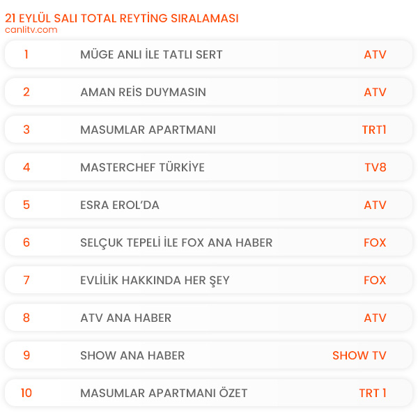 21 Eylül Salı günü total reyting kategorisinde günün en çok izlenen yapımı atv'de yayınlanan 'Müge Anlı ile Tatlı Sert' oldu. Listenin ikinci sırasında dün akşam atv'de yayınlanan Türk sinema filmi 'Aman Reis Duymasın' yer alırken, 'Masumlar Apartmanı' dizisi günü üçüncü sırada tamamladı. Tv8'in sevilen yarışma programı 'MasterChef Türkiye' günü dördüncü sırada tamamlarken, 'Esra Erol'da' programı listenin beşinci sırasında yer aldı. Günün diğer dizileri 'Baht Oyunu' ve 'Ada Masalı' ilk 10'da yer alamadı.