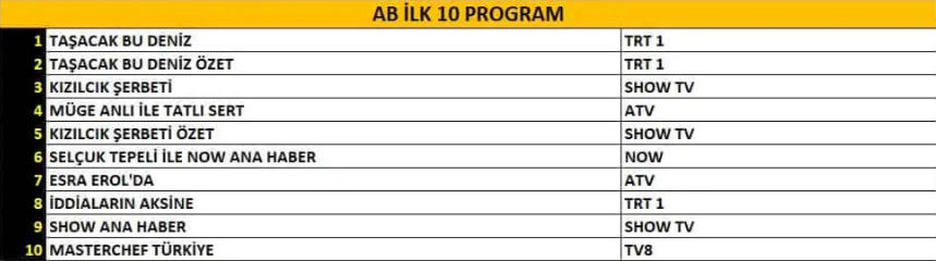AB izleyici grubunda da “Taşacak Bu Deniz” dizisi üstün performansını sürdürerek günün lideri oldu. Dizinin özet bölümü, ana bölüm kadar ilgi görerek ikinci sıraya yerleşti ve yapımın geniş izleyici kitlesini bir kez daha kanıtladı. “Kızılcık Şerbeti” isimli fenomen dizi ise dengeli reyting grafiğiyle üçüncülük koltuğunda kendine yer buldu.