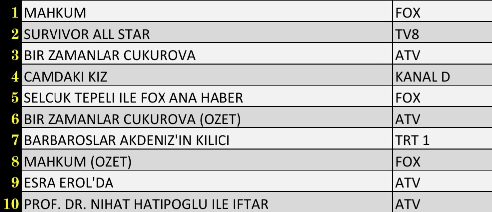 Total izleyici grubunda dün Fox TV ekranlarında yayınlanan Mahkum en çok izlenen olurken, TV8'de yine heyecan dolu dakikalar yaşatan 'Survivor All Star' ikinci oldu. ATV'de yayınlanan Bir Zamanlar Çukurova ise üçüncü oldu. Listenin devamı ise şöyle oluştu; Camdaki Kız dördüncü, Selçuk Tepeli ile Ana Haber beşinci Barbaroslar: Akdeniz’in Kılıcı yedinci sıraya yerleşen yapımlar arasında oldu.