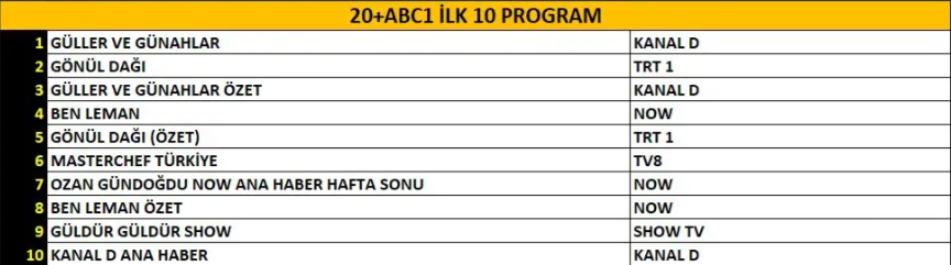 ABC1 reyting kategorisinde gecenin birincisi “Güller ve Günahlar” dizisi oldu. Dizinin güçlü hikâyesi ve dikkat çeken performansları, onu bu grupta da zirveye taşıdı. İkinci sırada, her hafta istikrarlı grafiğini sürdüren “Gönül Dağı” dizisi yer alırken; üçüncü sırada yine “Güller ve Günahlar” listede kendine yer bularak önemli bir başarıya imza attı.