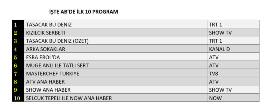 AB izleyici grubunda ise "Taşacak Bu Deniz" etkileyici performansıyla liderliğini koruyarak birinci sırada yer aldı. Duygusal sahneleri ve sürükleyici hikayesi ile geniş bir kitleye hitap eden "Kızılcık Şerbeti" dizisi ikinci sıraya yerleşirken, "Taşacak Bu Deniz" dizisinin özet bölümü bile yüksek izlenme oranıyla listeye üçüncü sıradan girmeyi başardı.