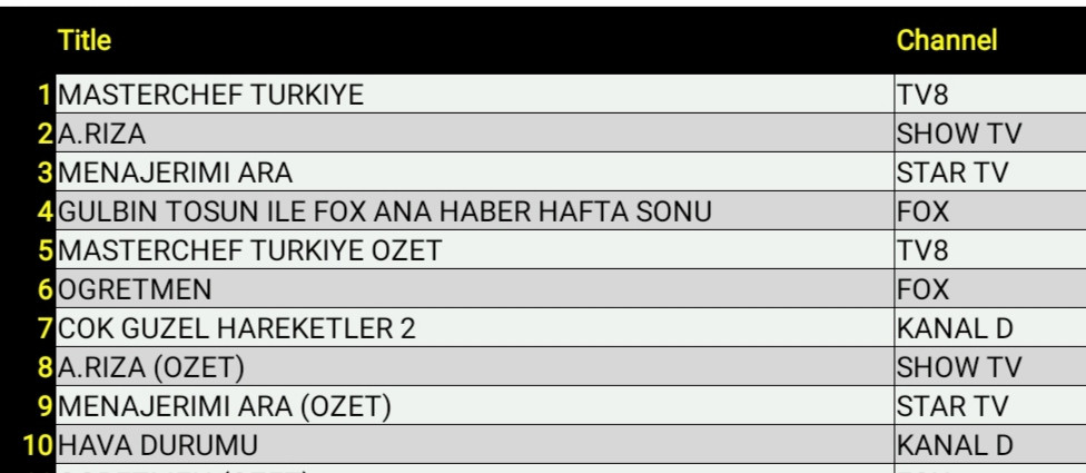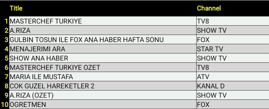Totalde ilk sırada TV8'in sevilen yarışma programı Masterchef Türkiye yer alırken, ikinci sırada Show Tv'ye ait A.Rıza ve üçüncü sırada Gülbin Tosun ile Fox Ana Haber yer alıyor.