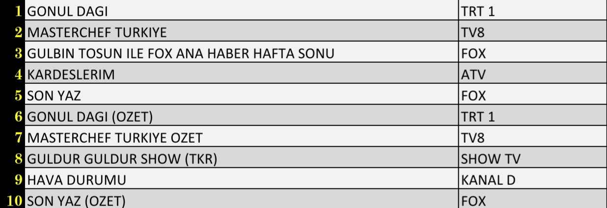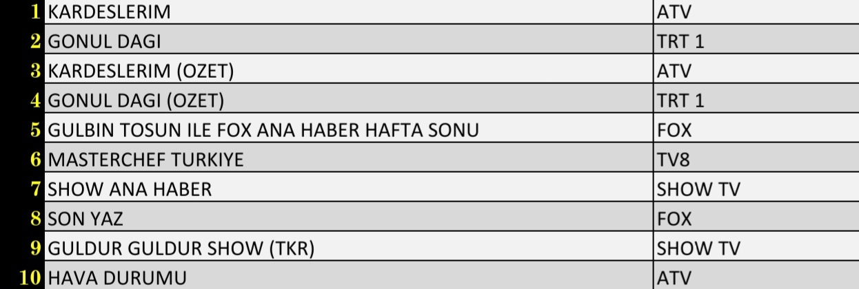 NOT: Televizyon İzleme Araştırma Komitesi (TİAK) tarafından ölçümlenen reyting sonuçlarının detaylarını ve ilk 100 program sıralaması yayınlanması yasaklandığı için sadece ilk 10 sıralamayı paylaşabiliyoruz.