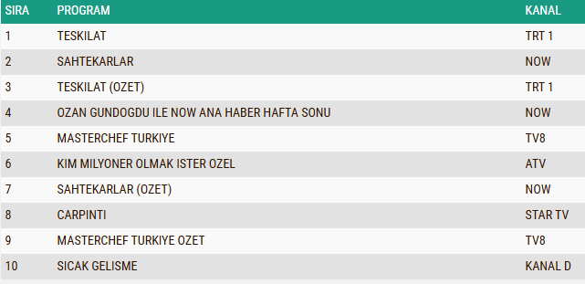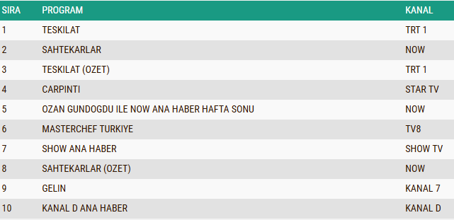 Reyting verileri, televizyon ekranlarında yoğun rekabetin sürdüğünü bir kez daha ortaya koydu. TRT 1'in sevilen dizisi Teşkilat, hem ana bölümü hem de özet yayınıyla Total izleyici listesinin zirvesine yerleşerek güçlü konumunu korudu. NOW TV'nin yeni dizisi Sahtekarlar ise yayınlandığı ilk haftada hem ana bölümüyle hem de özetleri ile üst sıralarda kendine yer bularak dikkat çekti. Bunun yanı sıra, yemek programları, ana haber bültenleri ve farklı türlerdeki dizilerde yüksek izlenme oranları ile geniş bir izleyici kitlesine ulaştı.