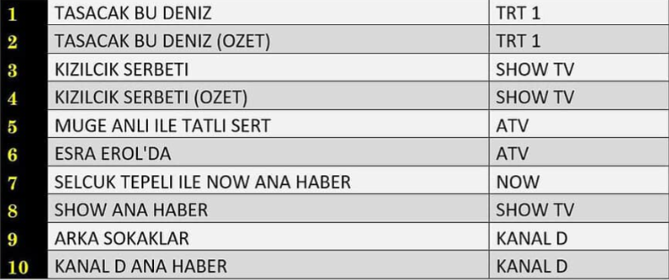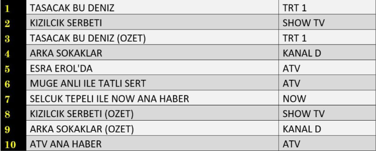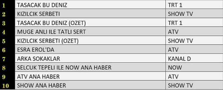 Üçüncü sırada ise “Taşacak Bu Deniz" dizisinin özet bölümü yer alıyor. Ana bölümü kadar ilgi gören özet yayın, prime-time kuşağında önemli bir izlenme başarısı elde ederek dizinin genel performansındaki gücü bir kez daha ortaya koymuş oldu.