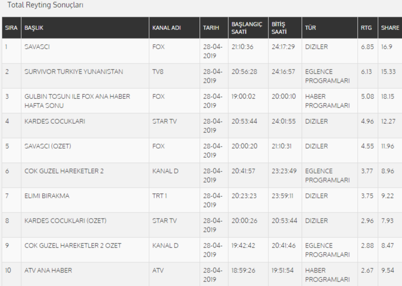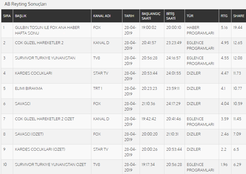 28 Nisan Pazar reyting sonuçları açıklandı. Birbirinden iddialı yapımların ekranlara geldiği günde 'Çok Güzel Hareketler 2' sürpriz yaparak güzel bir yükseliş yakaladı. Dünün izlenme oranlarına dair dün detayları sizler için derledik. İşte dünün reytingleri!
