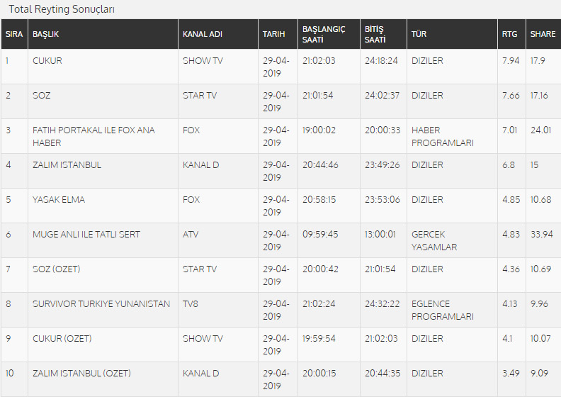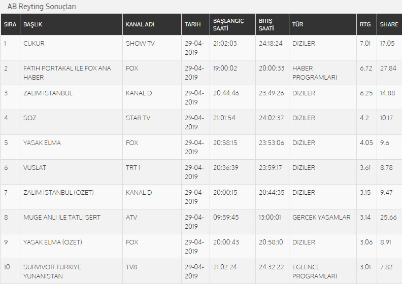 29 Nisan Pazartesi reyting sonuçları elimize ulaştı. Çukur, Zalim İstanbul, Söz, Vuslat ve Yasak Elma dizileri yeni bölümleriyle seyirci karşısına çıkarken, günün birincisi hangi dizi oldu? Dünün reytinglerini canlitv takipçileri için ayrıntılı olarak inceledik!