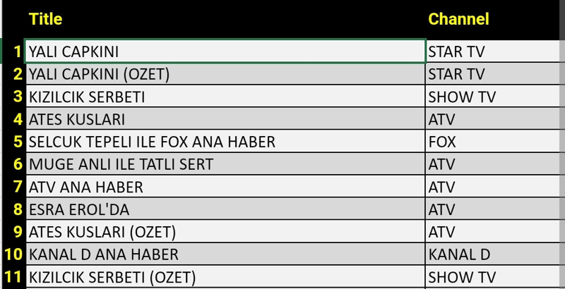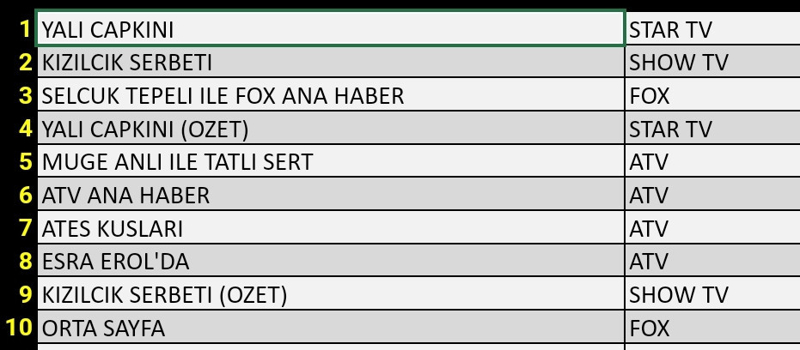 Yalı Çapkını, Kızılcık Şerbeti, FOX Ana Haber arasında yaşanan reyting fırtınasının yer aldığı 3 Mart 2023 Cuma günü yayınlanan programların ve dizilerin reyting sonuçları açıklandı. Rekabetin en yoğun yaşandığı Total’de birinci sırada Yalı Çapkını, ikinci sırada Yalı Çapkını özet bölümü, üçüncü sırada ise Kızılcık Şerbeti yer aldı.