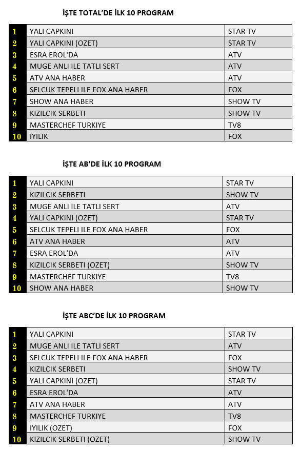 Selçuk Tepeli ile Fox Ana Haber ABC grubunda 3., AB grubunda 5., totalde ise 6. oldu. ATV Ana Haber ise totalde 5., AB grubunda 6., ABC grubundaysa 7. Olarak ilk 10 da yer aldı. Show Ana Haber totalde 7. Sırada yer alırken AB grubunda 10. Sırada yer aldı.