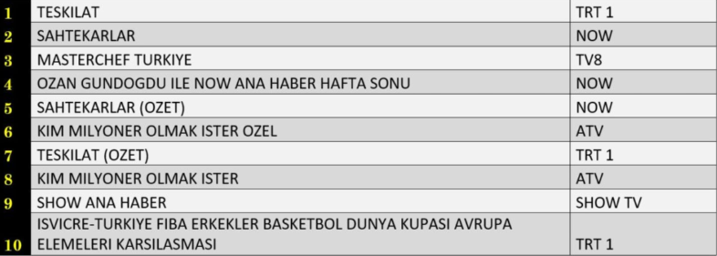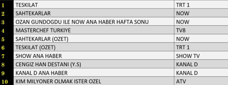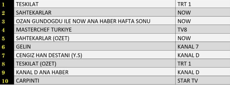 İkinci sırada ise son haftalarda dikkat çeken dizi “Sahtekarlar” yer aldı. Dizi, hem hikâyesi hem de oyunculuklarıyla izleyiciyi ekran başına çekmeyi başardı.