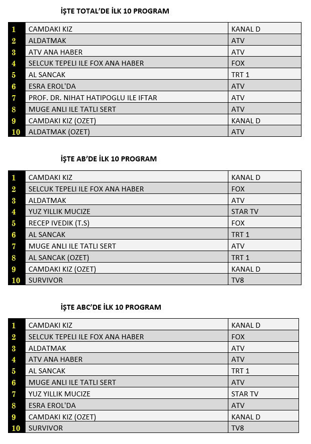 Not: TİAK'ın aldığı karar nedeniyle reyting sonuçlarının detaylarını ve ilk 100 program sıralamasını yayınlayamıyoruz.