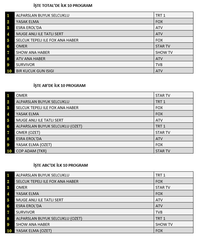 Alparslan Büyük Selçuklu, FOX Haber, Yasak Elma, Esra Erol’da ve Ömer dizisinin rekabetine sahne olan 30 Ocak 2023 Pazartesi gününe ait reyting sonuçları belli oldu. TRT1’in tarihi dönem dizisi Alparslan Büyük Selçuklu’nun zirvede rakipsiz kaldığı Total'de ikinci sırada Yasak Elma, Esra Erol'da ise üçüncü sırada kendine yer buldu. AB'de zirvenin adresi Ömer ile el değiştirirken Alparslan Büyük Selçuklu ikinci sırayı, Selçuk Tepeli ile FOX Ana Haber de üçüncü sırayı aldı.