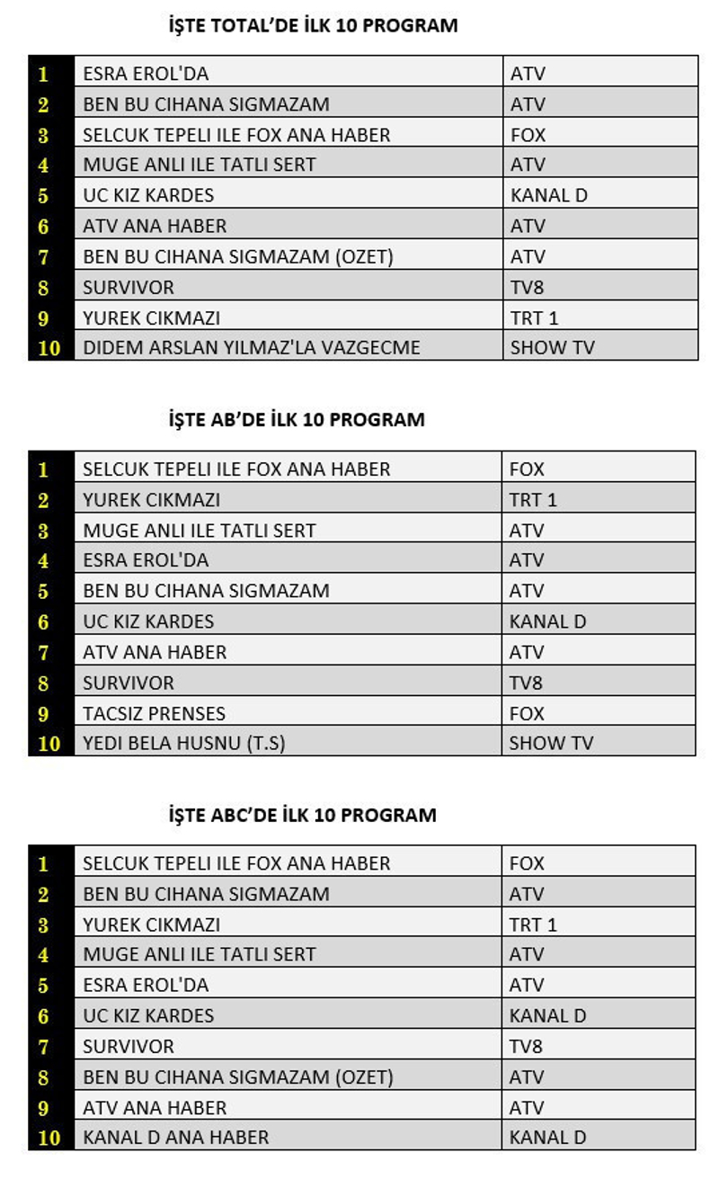 Total'de 1.sırada gündüz kuşağı programı "Esra Erol'da" 2. sırada Atv dizisi "Ben Bu Cihana Sığmazam", 3.sırada ise "Selçuk Tepeli İle Fox Ana Haber" yer aldı. Önemli bir reyting lsitesi olan AB'de ise 1.sırada ise "Selçuk Tepeli İle Fox Ana Haber" sürprizi yaşandı. 2.sırada TRT1 dizisi "Yürek Çıkmazı", 3.sırada ise gündüz kuşağı programı "Müge Anlı İle Tatlı Sert" yer aldı. İddialı dizilerin ilk ona bile giremediği gün sonunda reyting listesi şu şekilde oluştu: