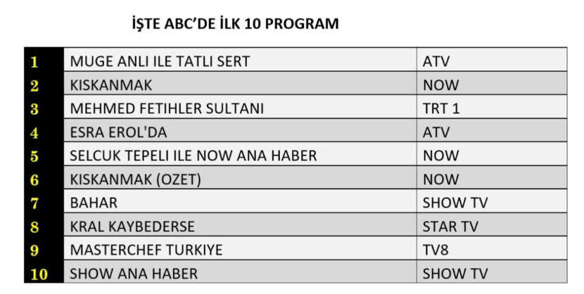 ATV ekranlarının fenomen haline gelen programı "Müge Anlı ile Tatlı Sert", 4 Kasım 2025 Salı günü de reyting listelerinde güçlü performansını devam ettirdi. ABC1 kategorisinde zirveye çıkarak birinci sıraya yerleşen program, AB grubunda üçüncü, Total izleyici kategorisinde ise ikinci sırada yer aldı.
