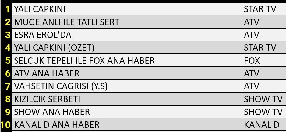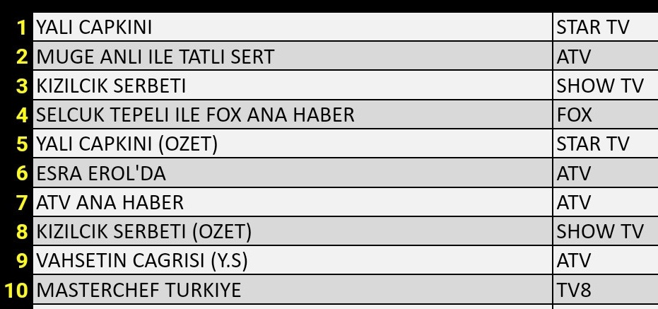 Gündüz kuşağında iki programın rekebeti kıyasıya devam ediyor. Her ikisi de ATV ‘de yayınlanan programlardan Müge Anlı İle Tatlı Sert her üç grupta da Yalı Çapkı’nının ardından 2. olarak listede kendine yer buldu. Esra Erol ‘da programı ise totalde 3., AB ve ABC grubunda 6. oldu.