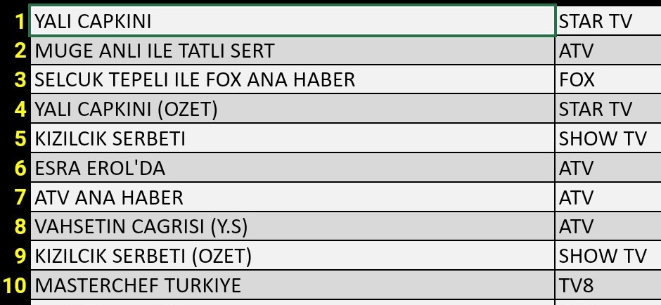 Haftanın son iş günü olan Cuma günü reytingleri nasıl gerçekleşti? Önceki haftalarda zirveye damga vuran Yalı Çapkını dizisi bu hafta kaçıncı sırada yer aldı? Gündüz kuşağı programlarında son durum ne? Dizilerin ara verdiği bu haftada ilk 10 ‘a damge vuran diziler hangileri? Haber bültenlerinde hangi ana haber bültenleri ilk 10 ‘a girdi ? Teker teker bütün programların değerlendirildiği reytın sonuçları yazımızın içeriğinde….