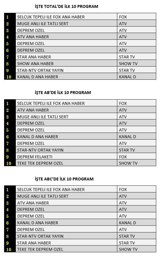 Bir başka reyting ölçümü olan AB'de ise 1.sırada yine “Selçuk Tepeli İle Fox Ana Haber” yer alırken 2.sırada “Atv Ana Haber”, 3.sırada “Müge Anlı İle Tatlı Sert” canlı yayını kendine yer buldu. ABC'de ise ilk sırayı Selçuk Tepeli ile Fox Haber alırken Müge Anlı 2. sırada Atv Deprem yayını 3. sıraya yerleşti.
