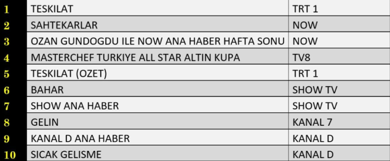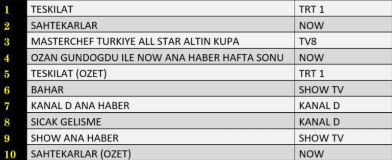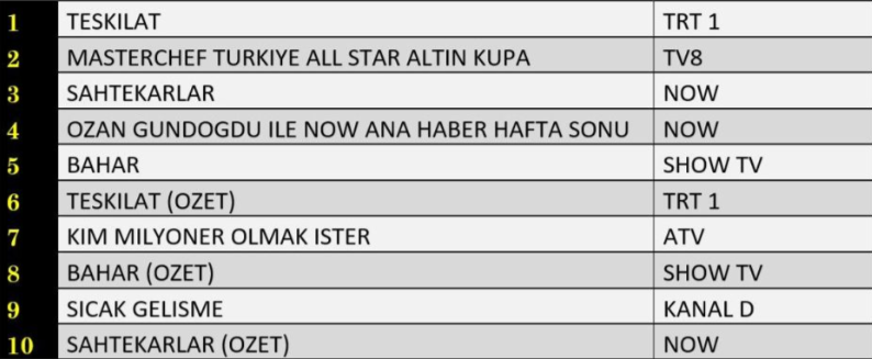 Listenin ikinci sırasında “Sahtekarlar” isimli sezonun yeni dizisi yer alırken, dizinin son bölümüyle birlikte yükselen temposu ve sosyal medyada konuşulan sahneleri dikkat çekti. Üçüncü sıraya ise “Ozan Gündoğdu ile NOW Ana Haber Hafta Sonu” yerleşti. Haber bülteni, günün önemli gelişmelerini ekranlara taşıyarak pazar akşamında güçlü bir izlenme oranı elde etmeyi başardı.
