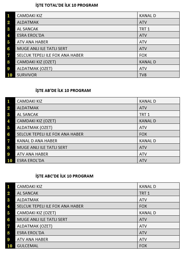 TRT1'in sevilen dizisi AL Sancak izlenirlilik oranlarını artırdığı 8 Haziran Perşembe günü Kanal D'de yayınlanan "Camdaki Kız" Total'de reytinglerde birinci sırayı, Atv'de gösterilen "Aldatmak" ikinci sırada yer aldı. TRT1'inbeğenilerek izlenen dizisi "Al Sancak" ise üçüncü sırayı elde ederek büyük başarı yakaladı. Günün sonucu en çok merak edilen reyting sıralaması AB'de ise "Camdaki Kız" birinci, "Aldatmak" ikinci ve "Al Sancak" üçüncü sırada yer aldı. 20ABC grubunda da benzer bir sonuç yaşandı ve "Camdaki Kız" birinci, "Aldatmak" ikinci ve "Al Sancak" üçüncü sırada yer aldı.