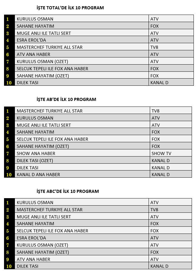 AB izleyici kategorisinde zirvenin adı 'tv8'de yayınlanan 'Masterchef Türkiye All Star' isimli program oldu. Total'de en çok izlenen yapım olmayı başaran 'Kuruluş Osman' ikinci, 'Müge Anlı ile Tatlı Sert' ise listenin üçüncü sırasında günü tamamladı.
