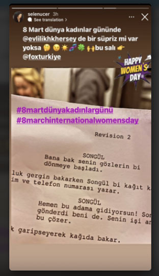 MF yapım tarafından hazırlanan uyarlama dizi Evlilik Hakkında Her Şey yayınlanacak yeni bölümü 8 Mart Dünya Kadınlar gününe denk geliyor. Kadrosunda pek çok oyuncu bulunan dizinin yayınlanacak bölümünde ayrıca iki kadın oyuncu konuk oyuncu olarak yer alacak. Ödüllü küçük oyunculardan Kübra Süzgün ile genç ve başarılı oyuncu Selen Uçer dizinin yeni bölümünde konuk olacaklar. Kadrosunda Gökçe Bahadır, Gökçe Eyüboğlu, Tülin Ece ve Sumru yavrucuk gibi kadınlar yer aldığı dizinin sosyal medya hesabından yapılan paylaşımında 8 Mart Dünya Kadınlar Gününe değinilmesi ise ayrıca beğenildi ve magazin ve sosyal medyada geniş şekilde yer aldı.