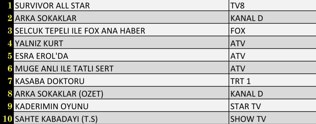 Total izleyici grubunda dün TV8 ekranlarında yayınlanan Survivor All Star en çok izlenen olurken Kanal D ekranlarının vazgeçilmezi haline gelen Arka Sokaklar dizisi ikinci oldu. Listenin devamı ise şöyle oluştu; Selçuk Tepeli ile FOX Ana Haber üçüncü, Yanlız Kurt dördüncü, Esra Erol'da beşinci sıraya yerleşti.
