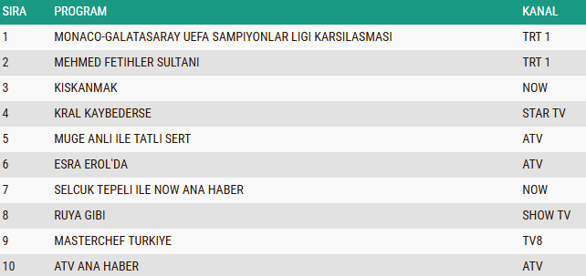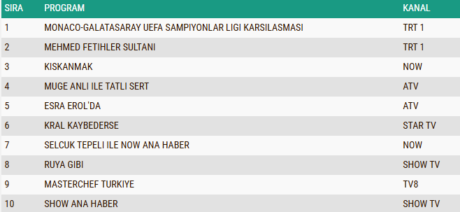 Total grubunda açıklanan sonuçlara göre geceye damgasını vuran yapım “Monaco–Galatasaray UEFA Şampiyonlar Ligi Karşılaşması” oldu. Futbol heyecanının zirveye çıktığı mücadele, yüksek izlenme oranıyla günün birincisi olarak listeye giriş yaptı.