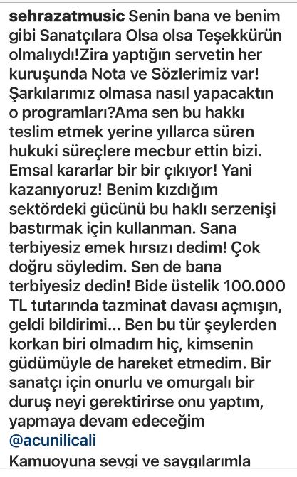 Ünlü isimler arasında yaşanan telif tartışması sosyal medyaya taşınınca Acun Ilıcalı da twitter hesabından bir açıklama yaptı. Dava açacağını söyeleyen Ilıcalı, o paylaşımda, "Bizden haksız bedel talep edip istediğini alamayınca hakaret yolunu seçen bu terbiyesiz kişiye cevabımızı mahkemede vereceğiz. Tazminatı ise işitme engelli miniklerimiz için kullanacağız" ifadelerini kullandı. Tarafların birbirleri için çok sert sözler kullandığı sosyal medya mesajları son olarak Şehrazat'ın yaptığı açıklama ile devam etti.