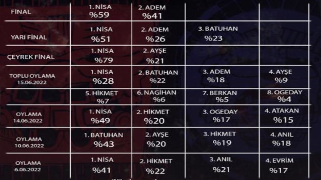 Tv 8 ekranlarında yayınlanan Survivor All Star 2022 yarışmasında Nisa Bölükbaşı 2022 yılının şampiyonu oldu. Ancak yarışmadan elenen Batuhan Karacakaya’nın annesi oylarla oynandığını ve oğlunun haksız yere elendiğini iddia etti. Bunun üzerine Acun Ilıcalı tarafından seyirci tarafından yarışmacılara gönderilen SMS oranları paylaşıldı. Konuyla ilgili açıklama yapan Acun Ilıcalı “emeğimizi töhmet altında bırakmasına izin vermem. Daha önce böyle saçma iddialar eden bir kadını da dava ettim çatır çatır da kazandım. Namusumuza dil uzatanı affetmem. Bu kadar kişinin emeğine dil uzatılmasına izin vermem” ifadelerini kullandı. Daha sonra Acun Ilıcalı tarafından yarışmacılara gönderilen SMS’ler paylaşıldı. Buna göre, finalde Nisa %59, Adem %41, Yarı Finalde, Nisa %51, Adem %26, Batuhan %23, Çeyrek Finalde, Nisa %79, Ayşe %21, Toplu oylamada ise, Nisa %28, Batuhan %22, Adem %18, Ayşe %9, Hikmet %7, Nagihan %6, Berkan %5 ve Ogeday ise %4 oy aldı.