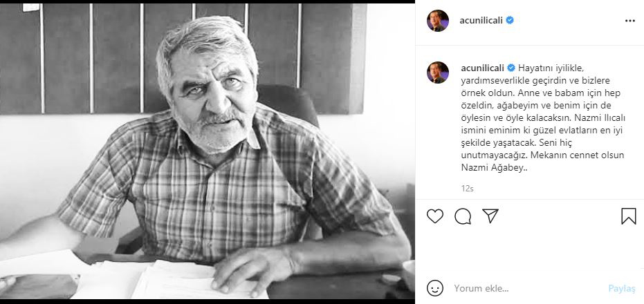 Ekrandaki birçok fenomen dizi ve programın yapımcısı olan Acun Ilıcalı'nın acı günü. Ünlü televizyoncunun amcası Nazmi Ilıcalı memleketi Erzurum'da vefat etti. Acun Ilıcalı amcasının vefat haberini Instagram hesabından amcasının fotoğrafıyla paylaştı. "Seni hiç unutmayacağız" diyen Acun Ilıcalı duygusal bir paylaşım yaptı. Ilıcalı, "Hayatını iyilikle, yardımseverlikle geçirdin ve bizlere örnek oldun. Anne ve babam için hep özeldin, ağabeyim ve benim için de öylesin ve öyle kalacaksın. Nazmi Ilıcalı ismini eminim ki güzel evlatların en iyi şekilde yaşatacak. Seni hiç unutmayacağız. Mekanın cennet olsun Nazmi Ağabey..." ifadelerini kullandı. Acun Ilıcalı'nın amcası Erzurum Milletvekili olan Mustafa Ilıcalı da amcasının oğlu Nazmi Ilıcalı'nın vefat haberini sosyal medya hesabından duyurdu.